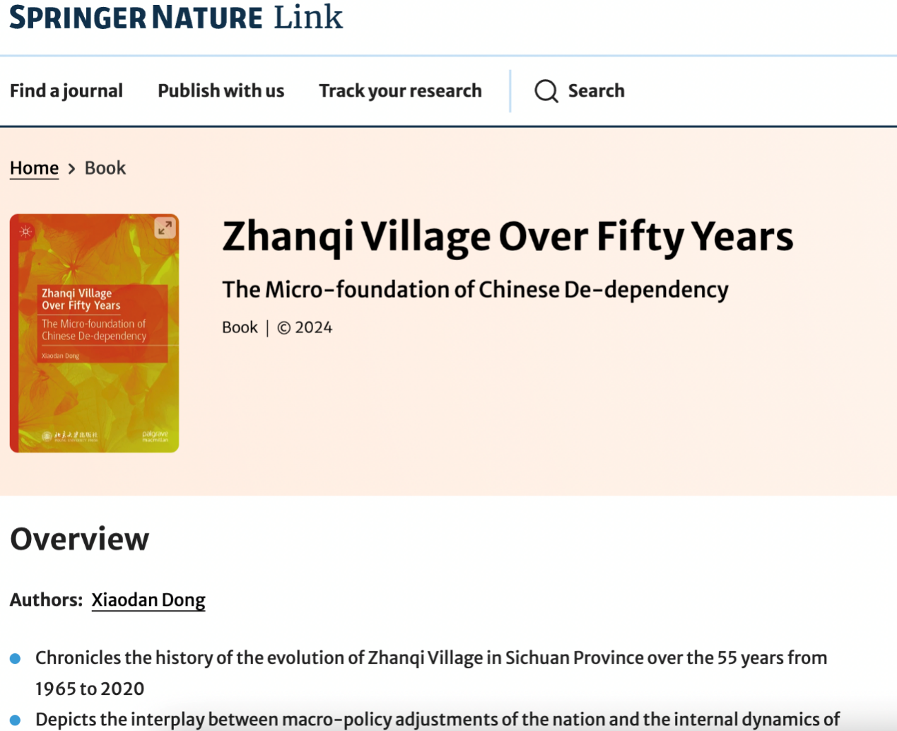 黑料网 董筱丹副教授的学术著作《Zhanqi Village Over Fifty Years: The Micro-Foundation of Chinese De-dependency》近日由施普林格·自然(Springer Nature)出版集团旗下的帕尔格雷夫·麦克米伦(Palgrave Macmillan)正式出版发行。