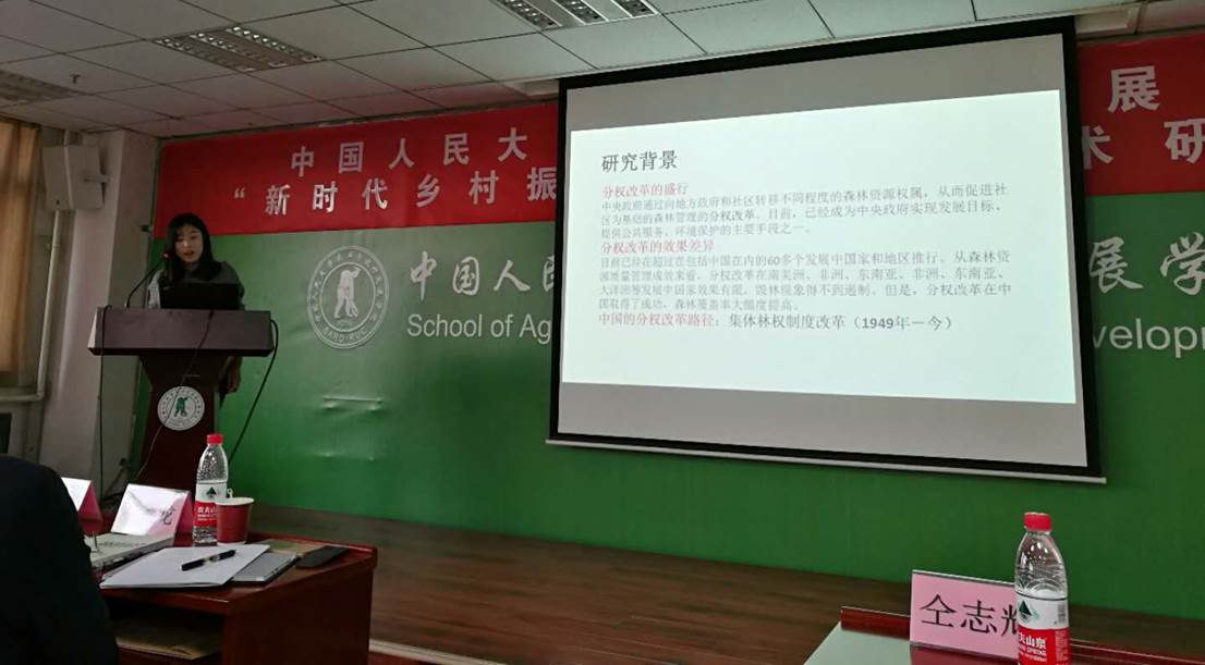 徐拓远报告了她的一篇研究论文“基于公共池塘资源产权约束的林权变迁研究”。文章将建国以来的集体林权制度改革划分为5个阶段,借鉴奥斯特罗姆的公共池塘资源产权权属框架,着重分析了建国以来集体林权制度改革的赋权主体、赋予的具体权利、改革成功的关键因素以及对改革成效的评价。