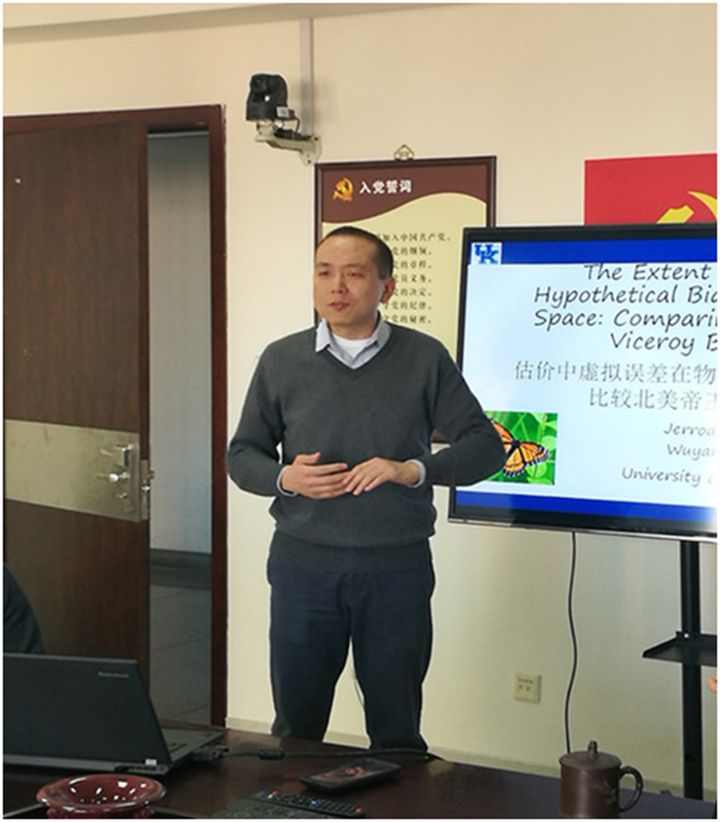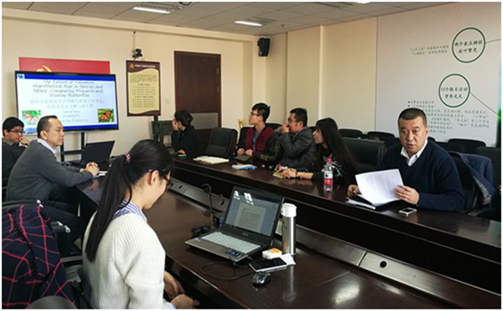师生做了题为 “资源定价中的虚拟误差在物种与距离上的界定:比较北美帝王蝶与副王蝶”的学术报告。报告由副院长郑适主持,王志刚教授、王西琴教授、生吉萍教授以及部分学生参加了讲座和交流。