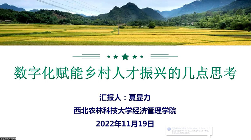 西北农林科技大学经济管理学院院长夏显力教授以“数字化赋能乡村人才振兴的几点思考”为题作主旨发言。他阐述了乡村人才振兴的内涵及其背景,以及通过数字化赋能实现乡村人才振兴的具体路径,为乡村人才培育过程中从产业体系端、乡村管理端、技术专员端打造适合于未来乡村振兴的人才队伍提出了展望。