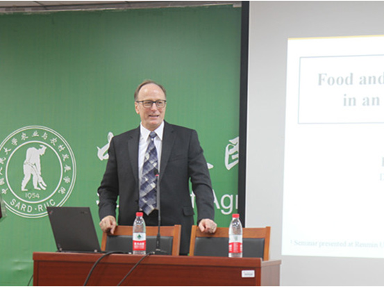 并作学术报告,主题为“Food and Environmental Security in an Era of Globalization”。报告由郑适副院长主持,庞晓鹏副院长、彭亚拉副教授、吕亚荣副教授等参加报告会。